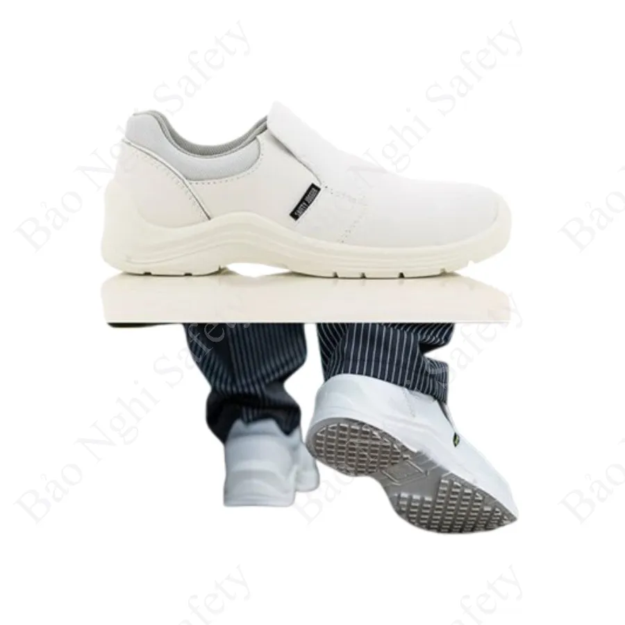 - Thân giày bảo hộ chống va đập được làm từ chất liệu Microfiber: dễ lau chùi, luôn giữ màu trắng sạch, thích hợp môi trường thực phẩm và y tế.