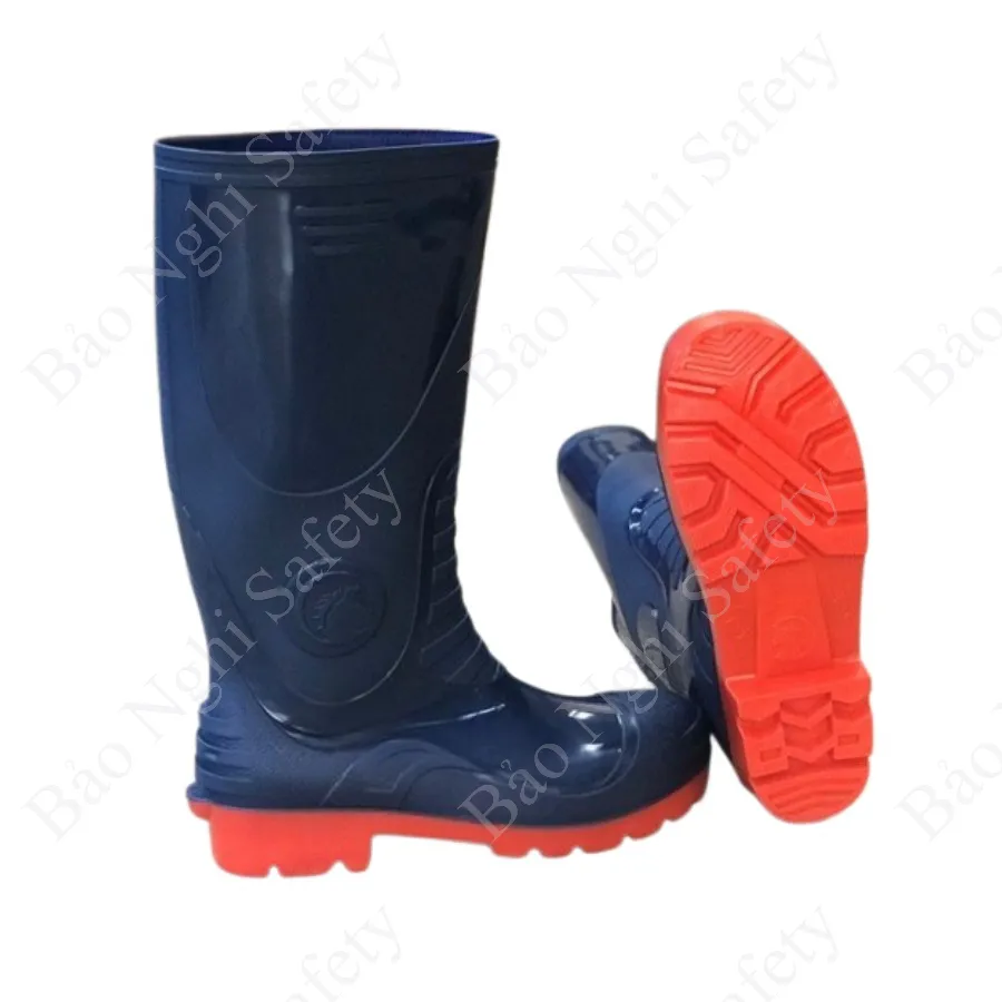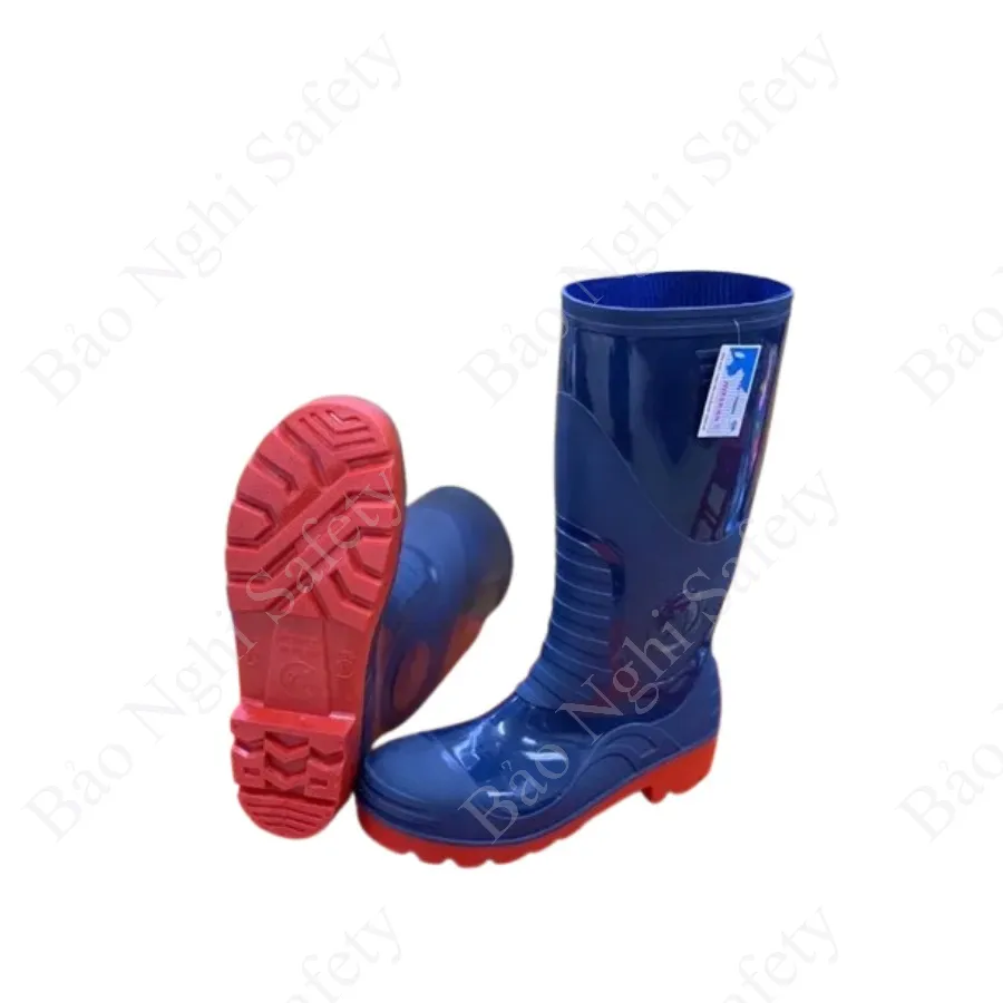 Ủng bảo hộ Hoa San mũi thép: màu xanh dương đế đỏ sử dụng tốt trong môi trường xây dựng, công trình, đế dày giúp chống trơn trượt tốt, lớp nhựa dày giúp chịu được nhiệt độ cao trong thời gian ngắn.