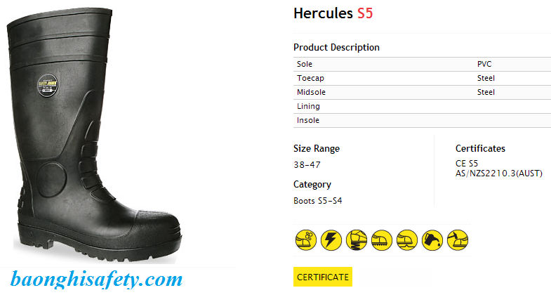 Ủng nhựa bảo hộ lao động Jogger Hercules S5 đáp ứng mọi yêu cầu khắt khe về an toàn của Liên Minh Châu Âu (CE S3)cũng như Mỹ (ASTM), (USA), ANSI Z41-1999 (PHILIP), Nhật (JIS (JAPAN) ).