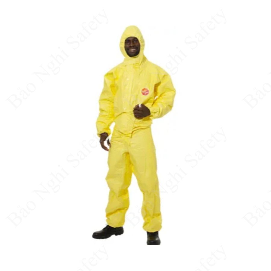 - Quần áo liền thân chống hóa chất với thiết kế áo liền quần có mũ, chun co giãn ở cổ tay, cổ chân, eo giúp ôm sát nhưng vẫn thoải mái. Màu vàng nổi bật, dễ nhận diện trong môi trường nguy hiểm.