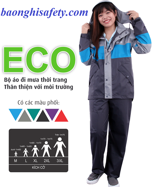 ÁO MƯA BỘ ECO – Với ý nghĩa là sinh thái, mang đến cho người tiêu dùng bộ quần áo đi mưa thời trang, tiện dụng và thân thiện với môi trường.