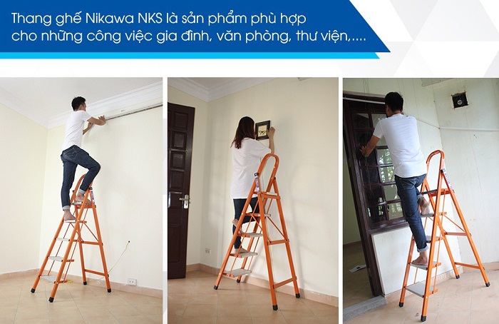 THANG GHẾ NIKAWA NKS 05 được sử dụng trong nhiều trong các công việc : gia đình ,văn phòng ,thư viện gắn biển quảng cáo, vệ sinh kính , sửa chữa các vật dụng điện trên cao, sơn cửa…